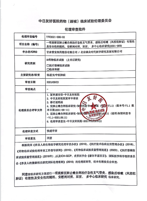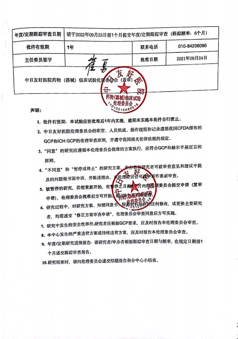 項目所屬的有效性RCT臨床試驗研究于2021年9月24日通過組長單位(中日友好醫(yī)院)的倫理審查,并于9月27日取得倫理批件。其他研究中心正以組長單位倫理批件為前置條件有序完成項目立項和倫理立項,近日已有4家分中心陸續(xù)拿到倫理批件,其中白山市中醫(yī)院率先完成兩例受試者入組,標(biāo)志著有效性RCT臨床試驗研究項目病例入組工作正式開始。