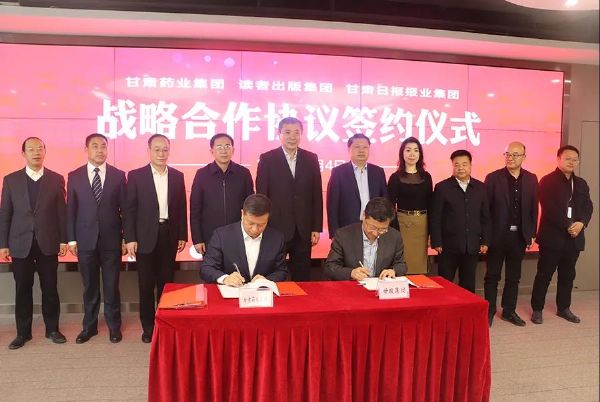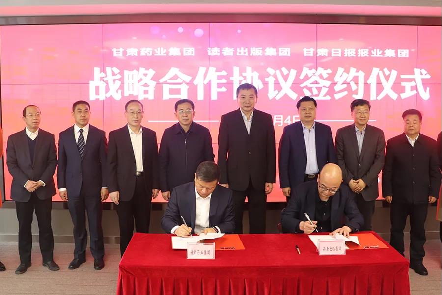 甘肅藥業(yè)集團(tuán)和讀者出版集團(tuán)有限公司、甘肅日?qǐng)?bào)報(bào)業(yè)集團(tuán)有限責(zé)任公司在甘肅新媒體集團(tuán)舉行戰(zhàn)略合作簽約儀式,竇生銘代表集團(tuán)公司簽署協(xié)議。