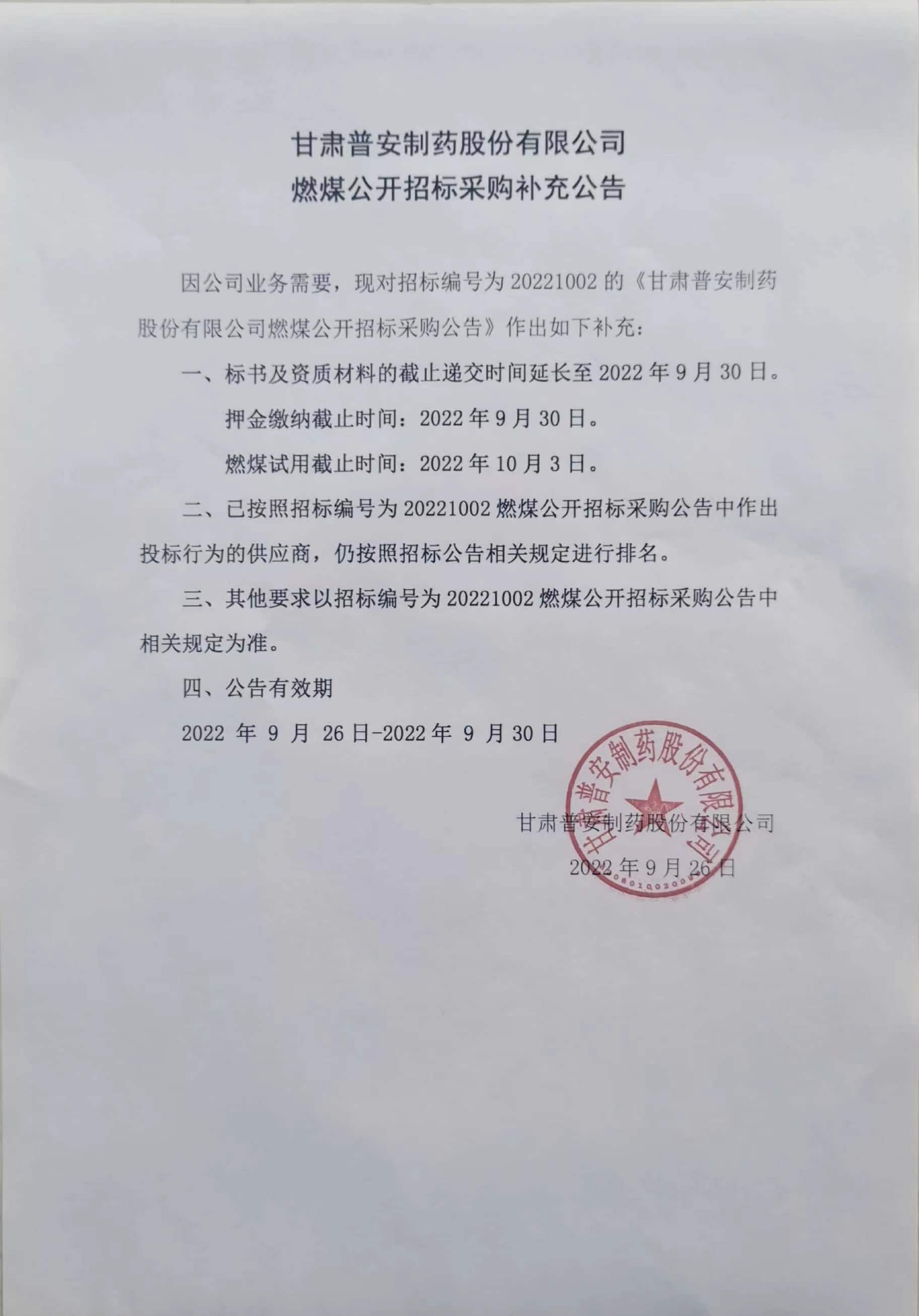 甘肅普安制藥股份有限公司燃煤公開(kāi)招標(biāo)采購(gòu)補(bǔ)充公告