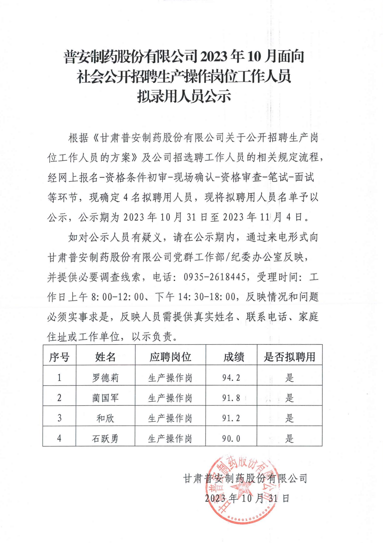 普安制藥股份有限公司2023年10月面向 社會公開招聘生產(chǎn)操作崗位工作人員擬錄用人員公示