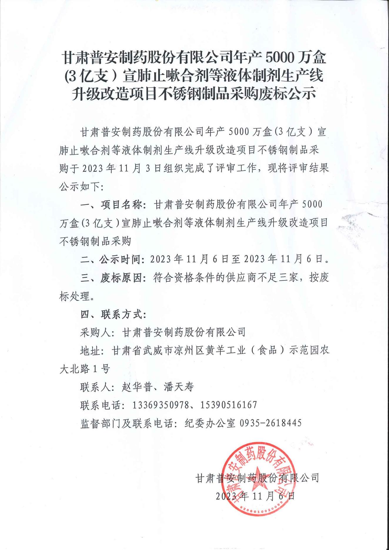 甘肅普安制藥股份有限公司年產(chǎn)5000萬(wàn)盒(3億支)宣肺止嗽合劑等液體制劑生產(chǎn)線升級(jí)改造項(xiàng)目不銹鋼制品采購(gòu)廢標(biāo)公示