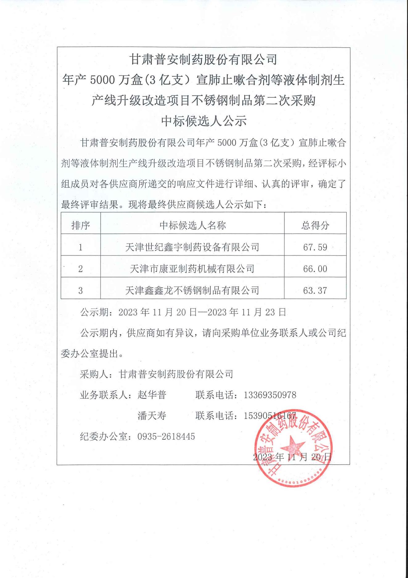 甘肅普安制藥股份有限公司年產(chǎn)5000萬盒(3 億支)宣肺止嗽合劑等液體制劑生產(chǎn)線升級(jí)改造項(xiàng)目不銹鋼制品第二次采購(gòu)中標(biāo)候選人公示