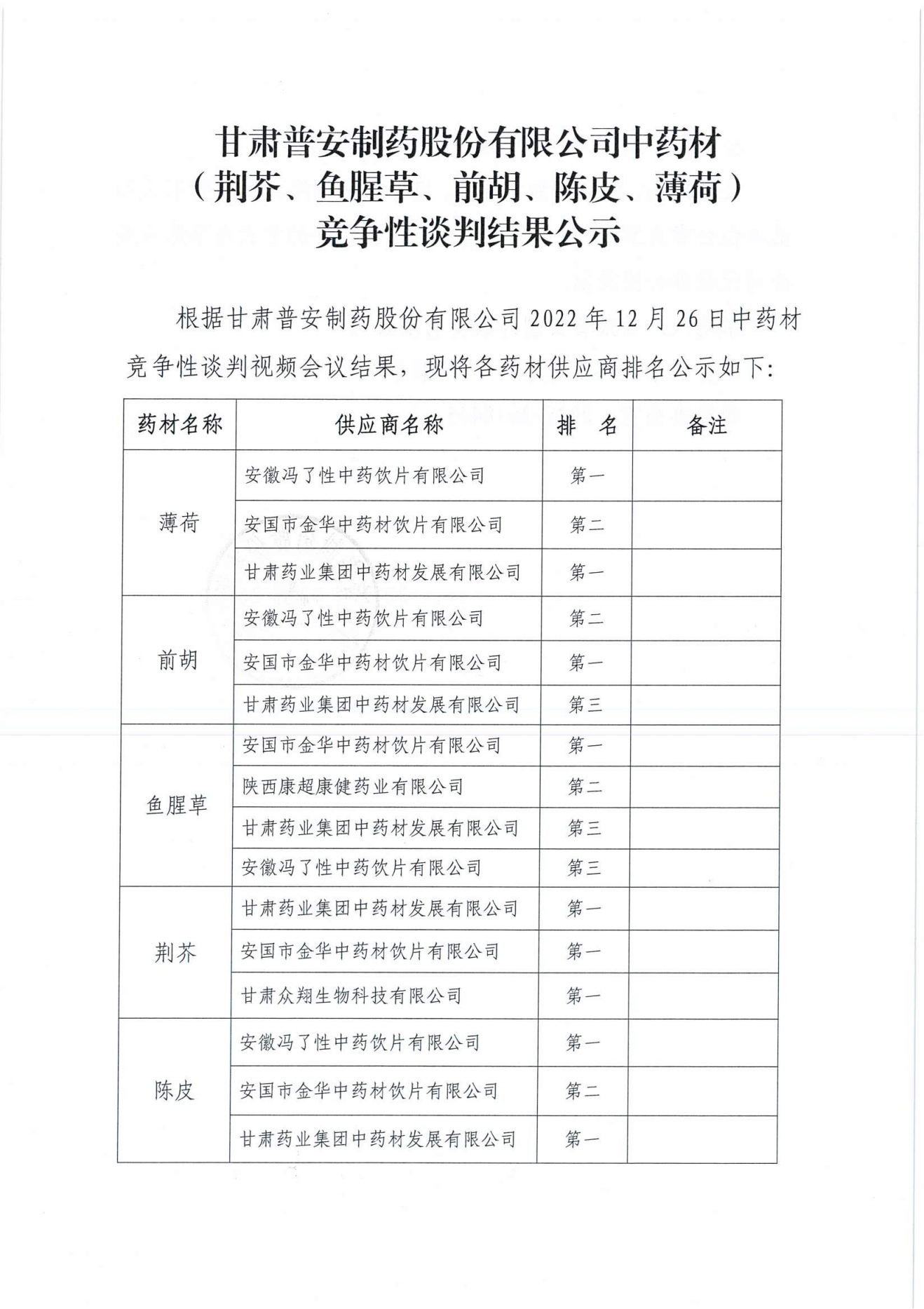 甘肅普安制藥股份有限公司 中藥材(荊芥、魚腥草、前胡、陳皮、薄荷)競(jìng)爭(zhēng)性談判結(jié)果公示