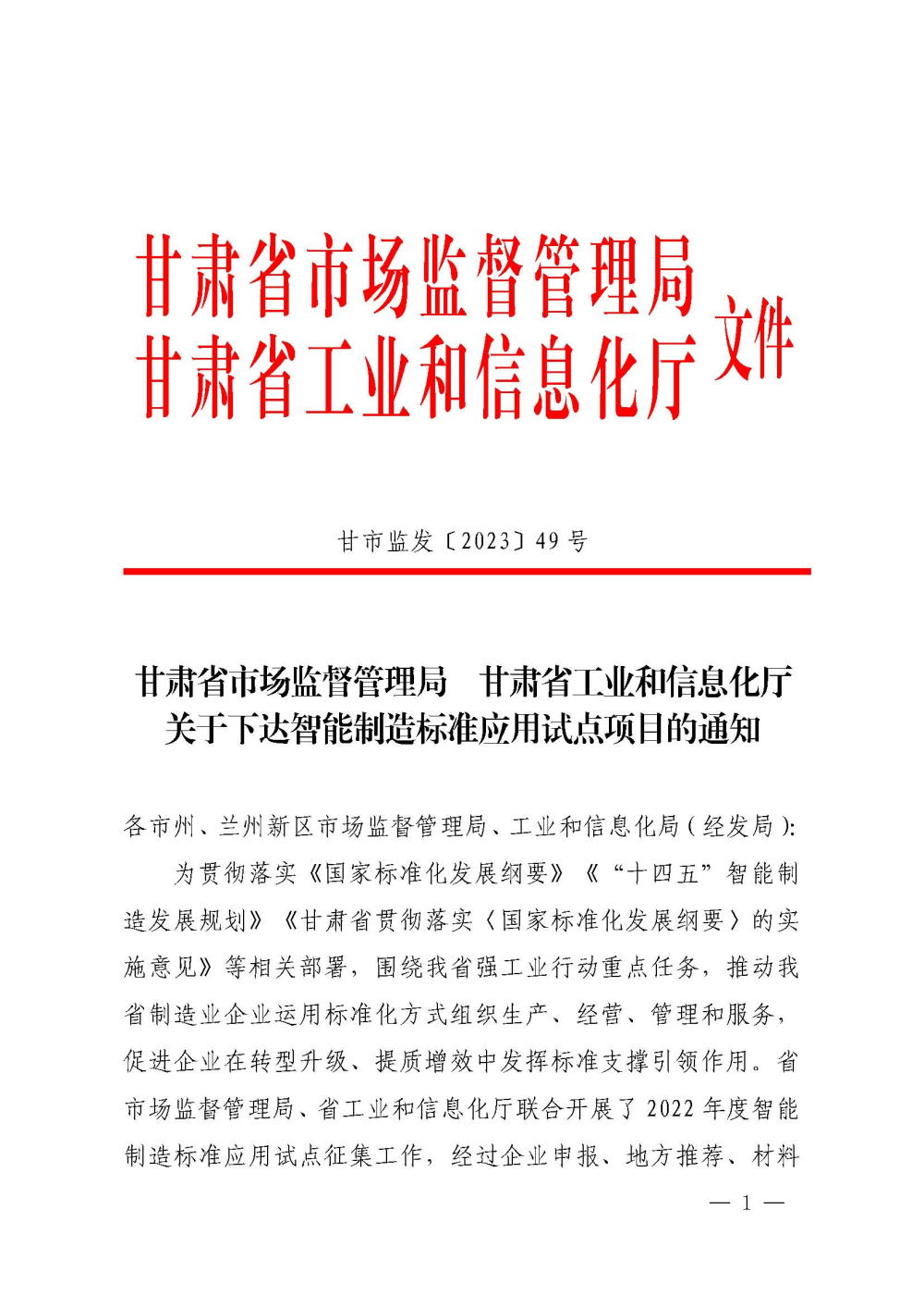 近日,甘肅省市場監(jiān)督管理局、甘肅省工業(yè)和信息化廳公布了省級智能制造標準應(yīng)用試點項目名單。