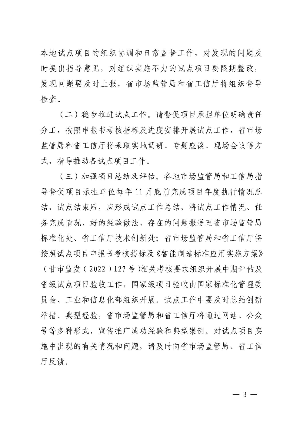 省級智能制造標準應(yīng)用試點項目建設(shè)是為貫徹落實《國家標準化發(fā)展綱要》《“十四五”智能制造發(fā)展規(guī)劃》《甘肅省貫徹落實〈國家標準化發(fā)展綱要〉的實施意見》等相關(guān)部署,圍繞我省強工業(yè)行動重點任務(wù),推動我省制造業(yè)企業(yè)運用標準化方式組織生產(chǎn)、經(jīng)營、管理和服務(wù),促進企業(yè)在轉(zhuǎn)型升級、提質(zhì)增效中發(fā)揮標準支撐引領(lǐng)作用。