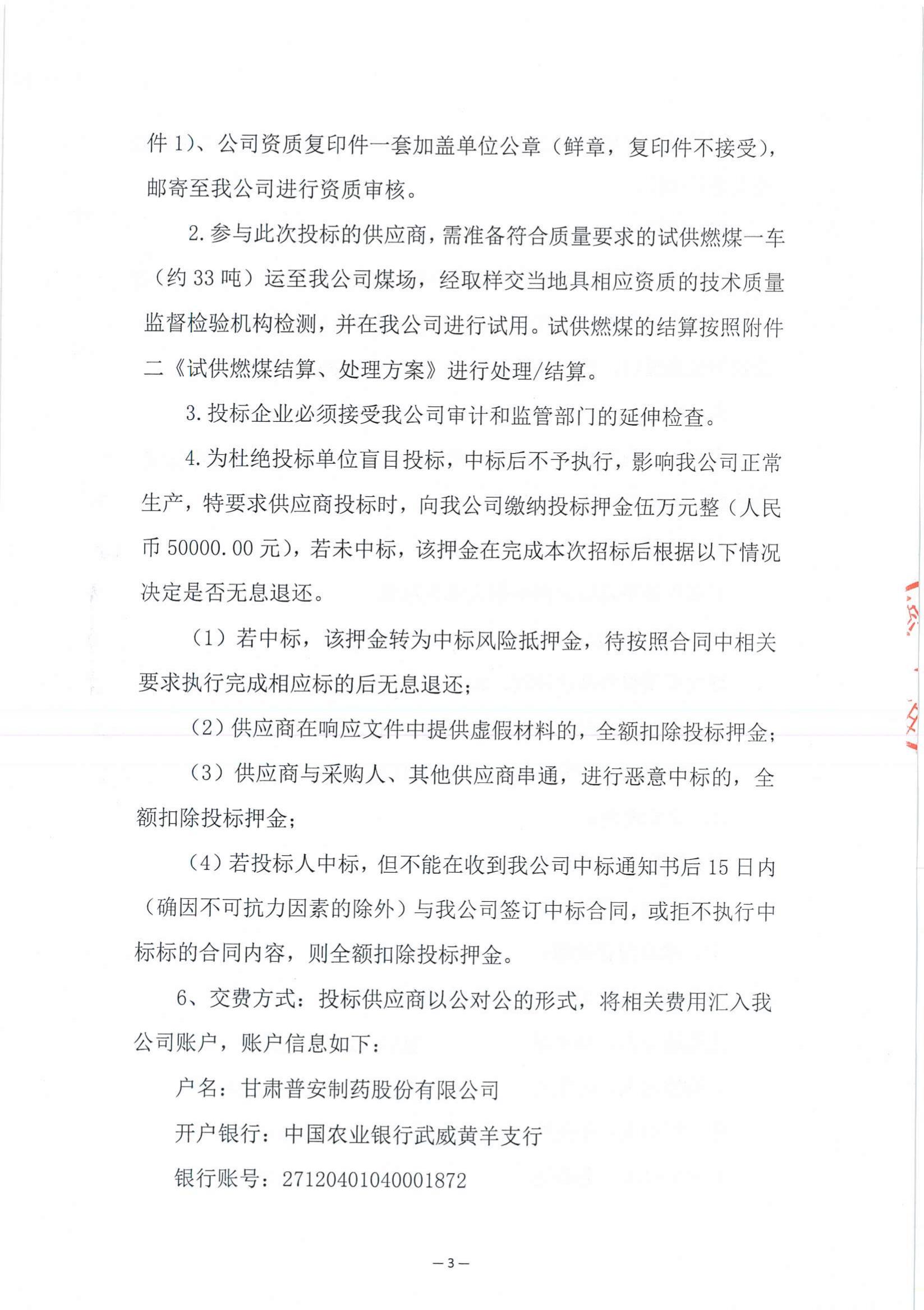 根據(jù)《甘肅普安制藥股份有限公司大宗物資招標(biāo)釆購(gòu)管理制度》相關(guān)規(guī)定,對(duì)燃煤以公開(kāi)征集、競(jìng)爭(zhēng)性磋商的方式進(jìn)行招標(biāo)采購(gòu),歡迎全國(guó)各地符合資格條件的供應(yīng)商踴躍參加。