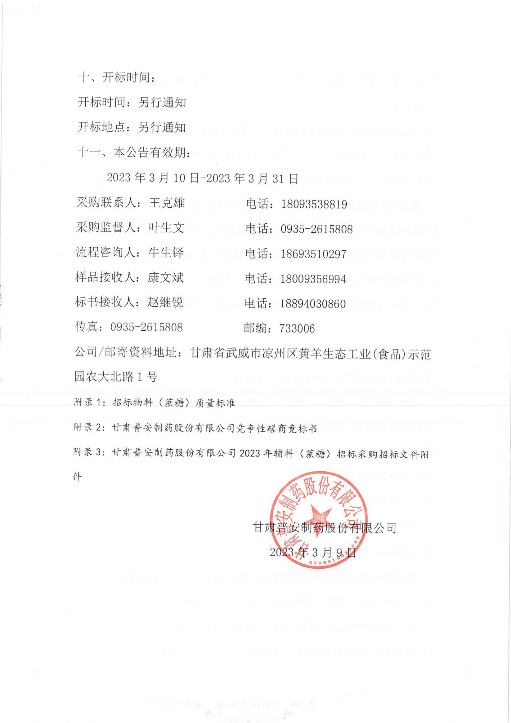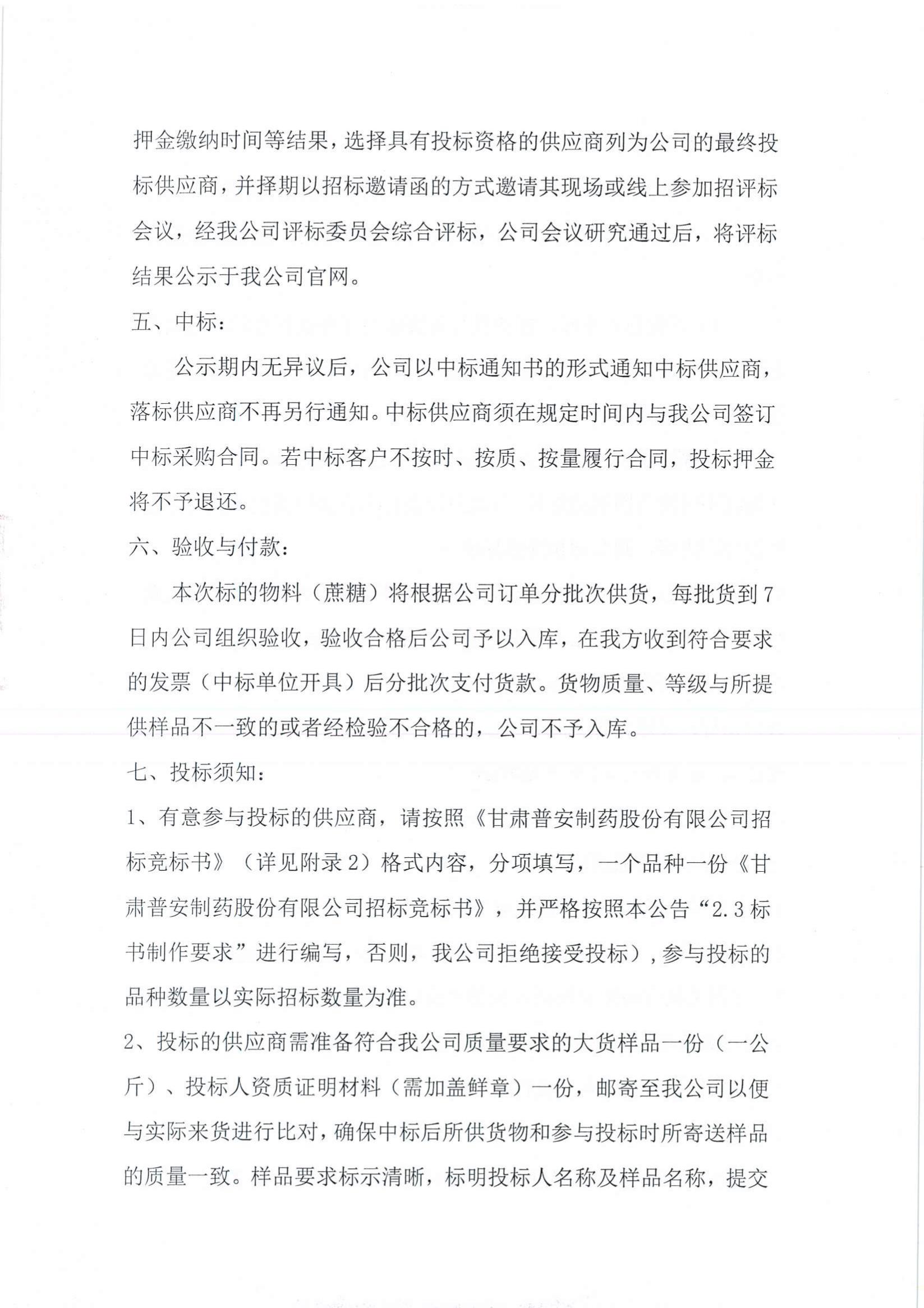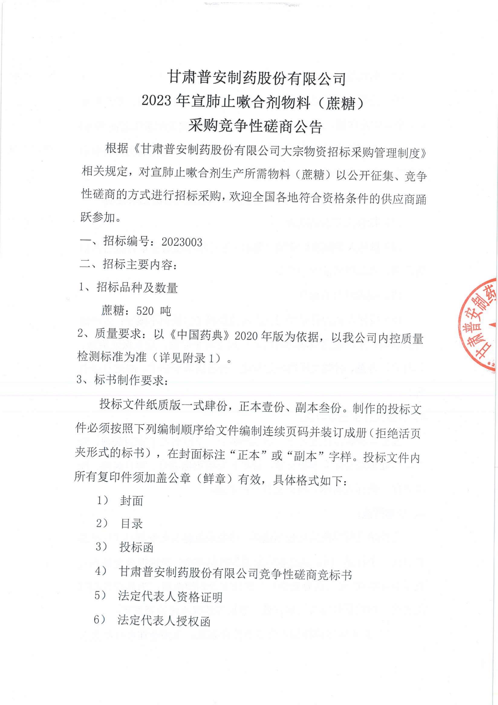 具體內(nèi)容詳見附件:甘肅普安制藥股份有限公司2023年宣肺止嗽合劑物料(蔗糖)采購競爭性磋商公告