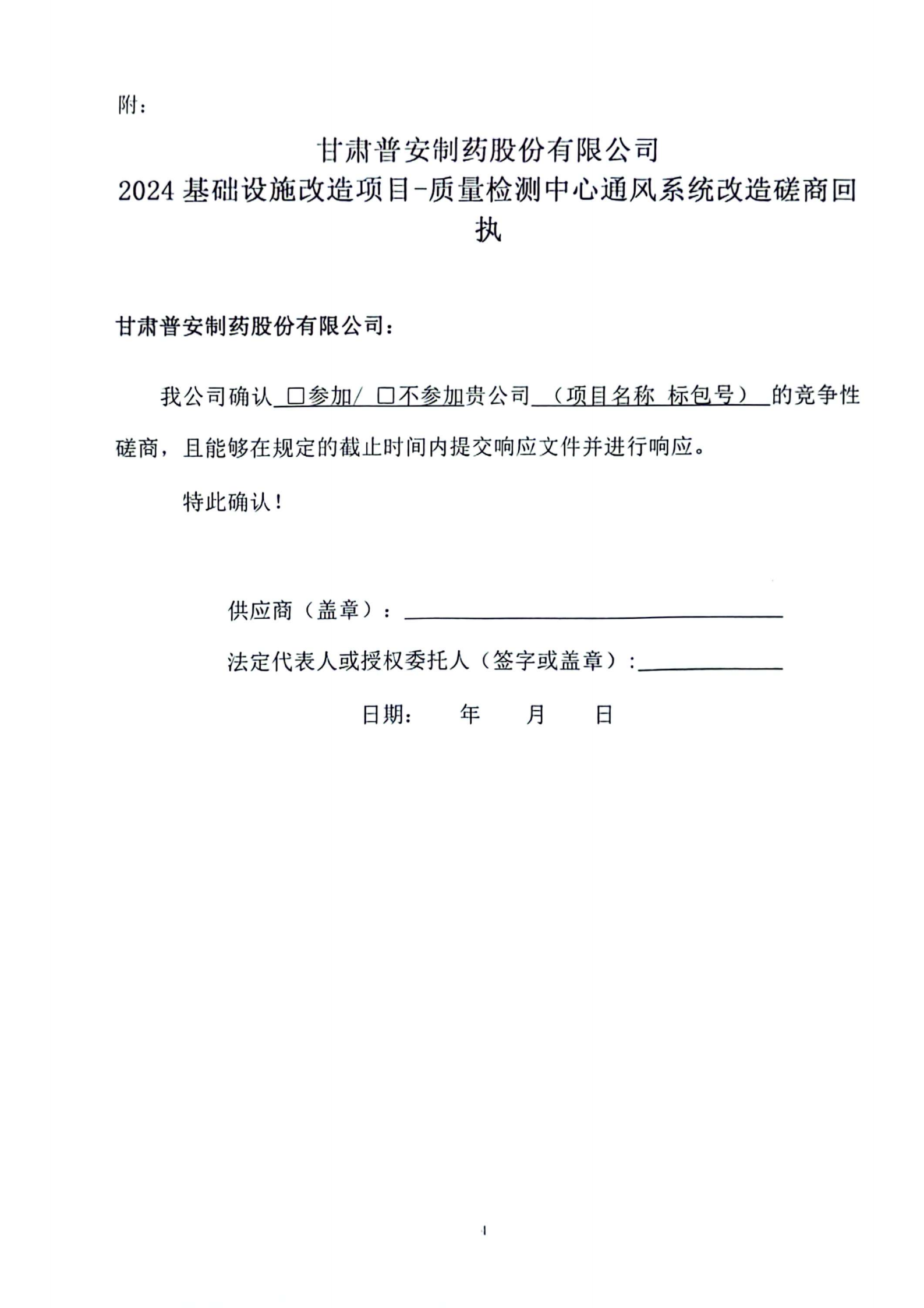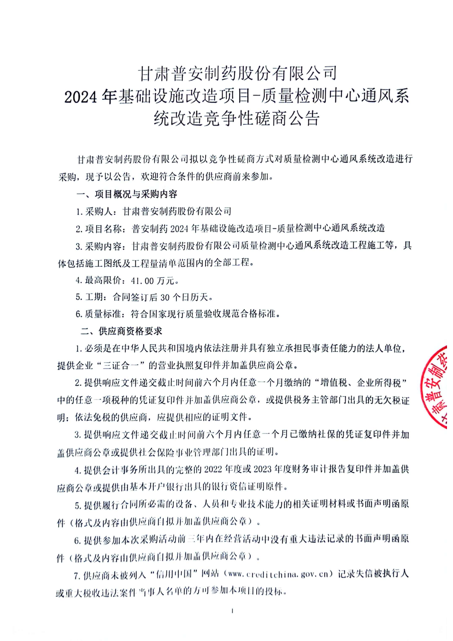 甘肅普安制藥股份有限公司2024年基礎(chǔ)設(shè)施改造項目-質(zhì)量檢測中心通風(fēng)系統(tǒng)改造競爭性磋商公告