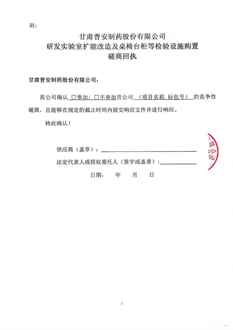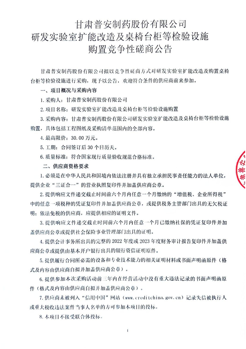 甘肅普安制藥股份有限公司研發(fā)實(shí)驗(yàn)室擴(kuò)能改造及桌椅臺柜等檢驗(yàn)設(shè)施購置競爭性磋商公告