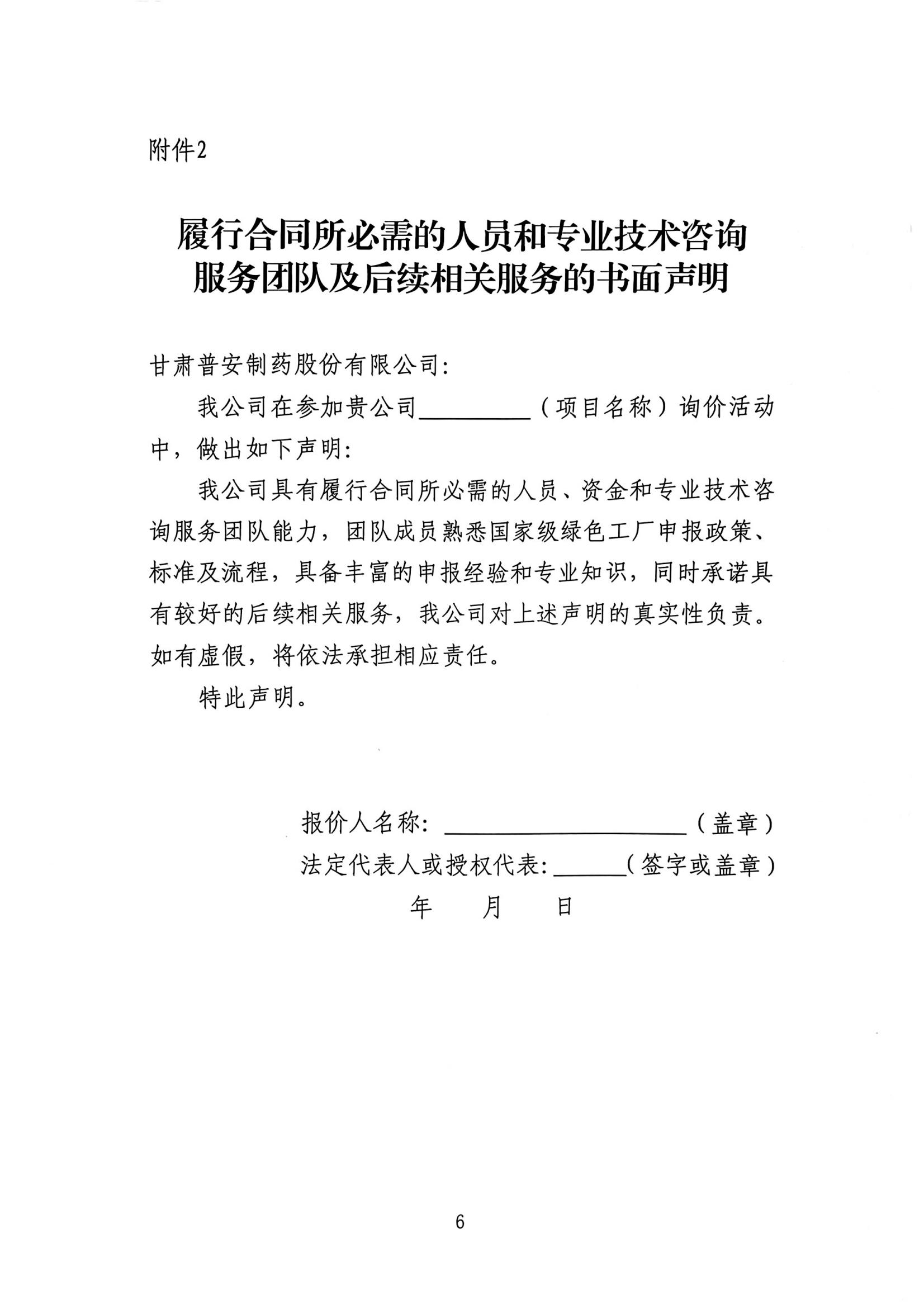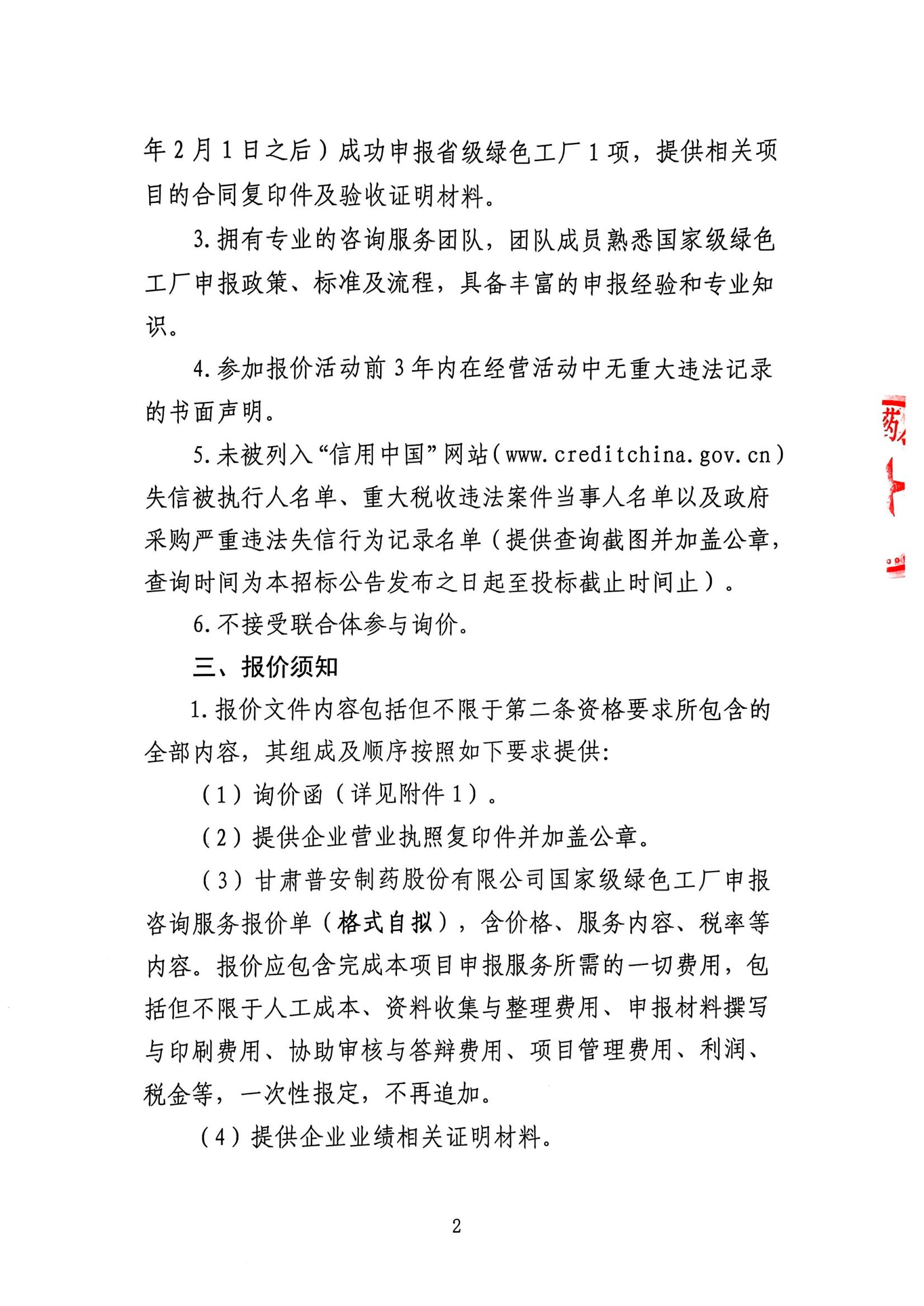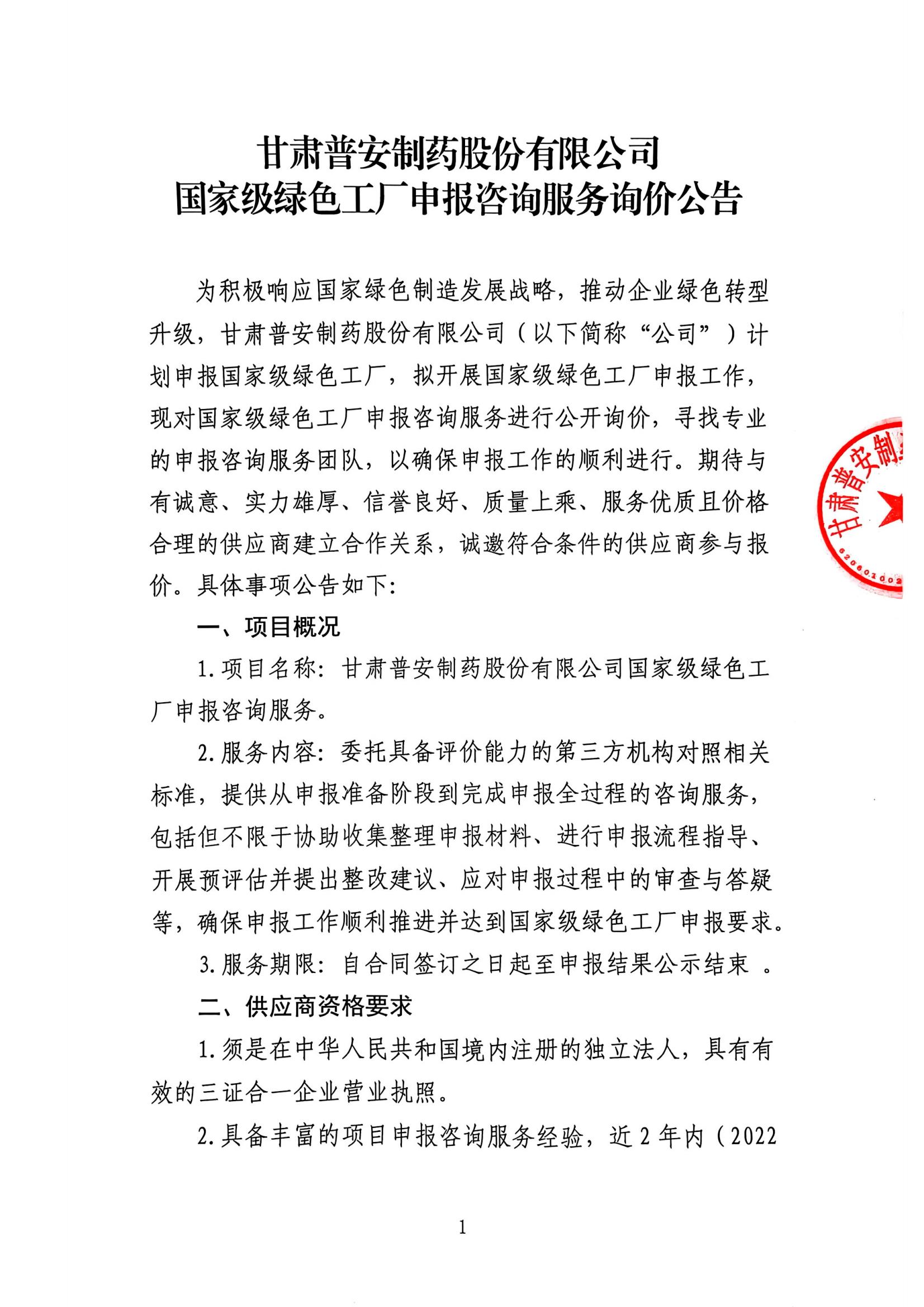 甘肅普安制藥股份有限公司國(guó)家級(jí)綠色工廠申報(bào)咨詢服務(wù)詢價(jià)公告