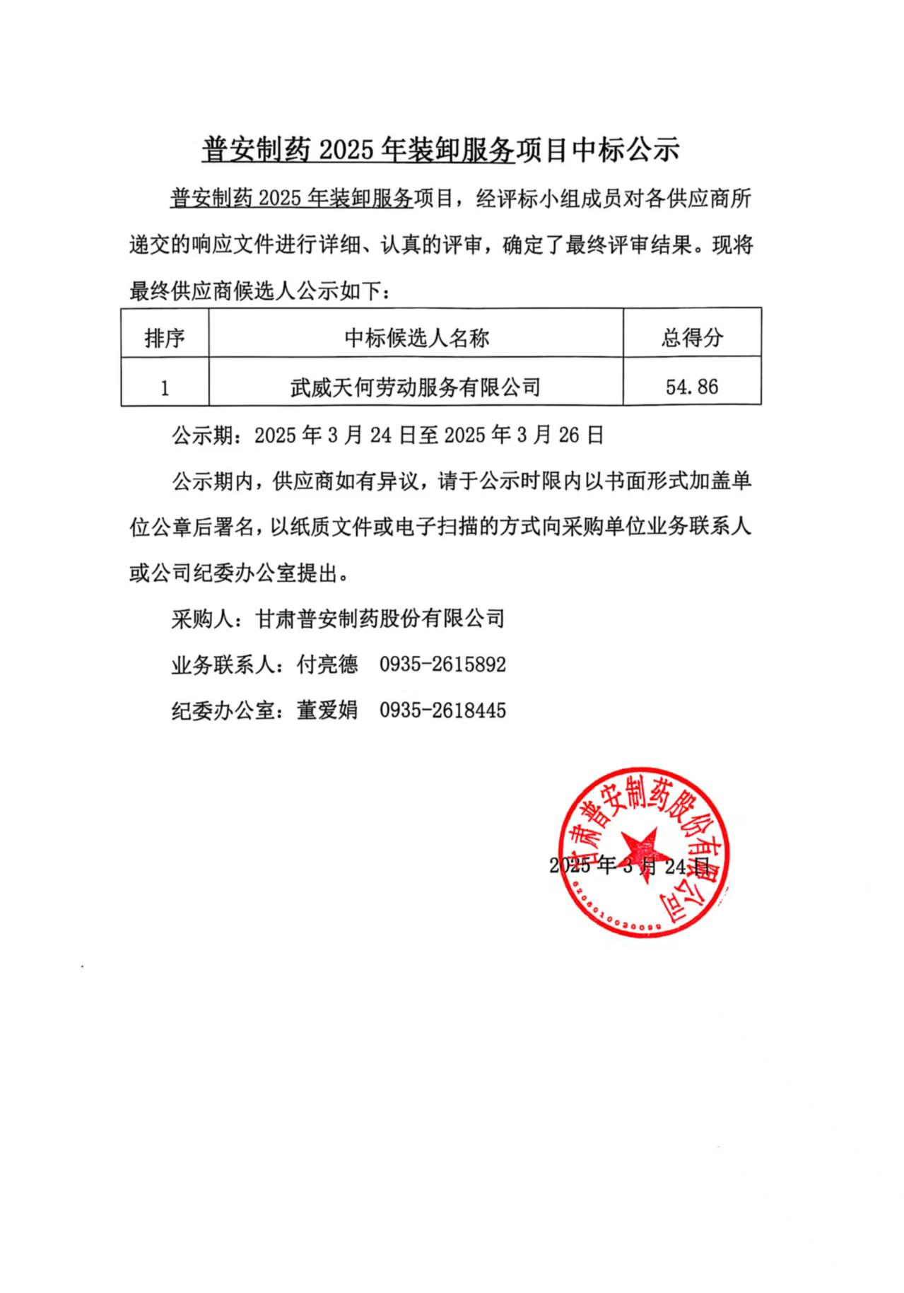 普安制藥 2025 年裝卸服務(wù)項目中標公示