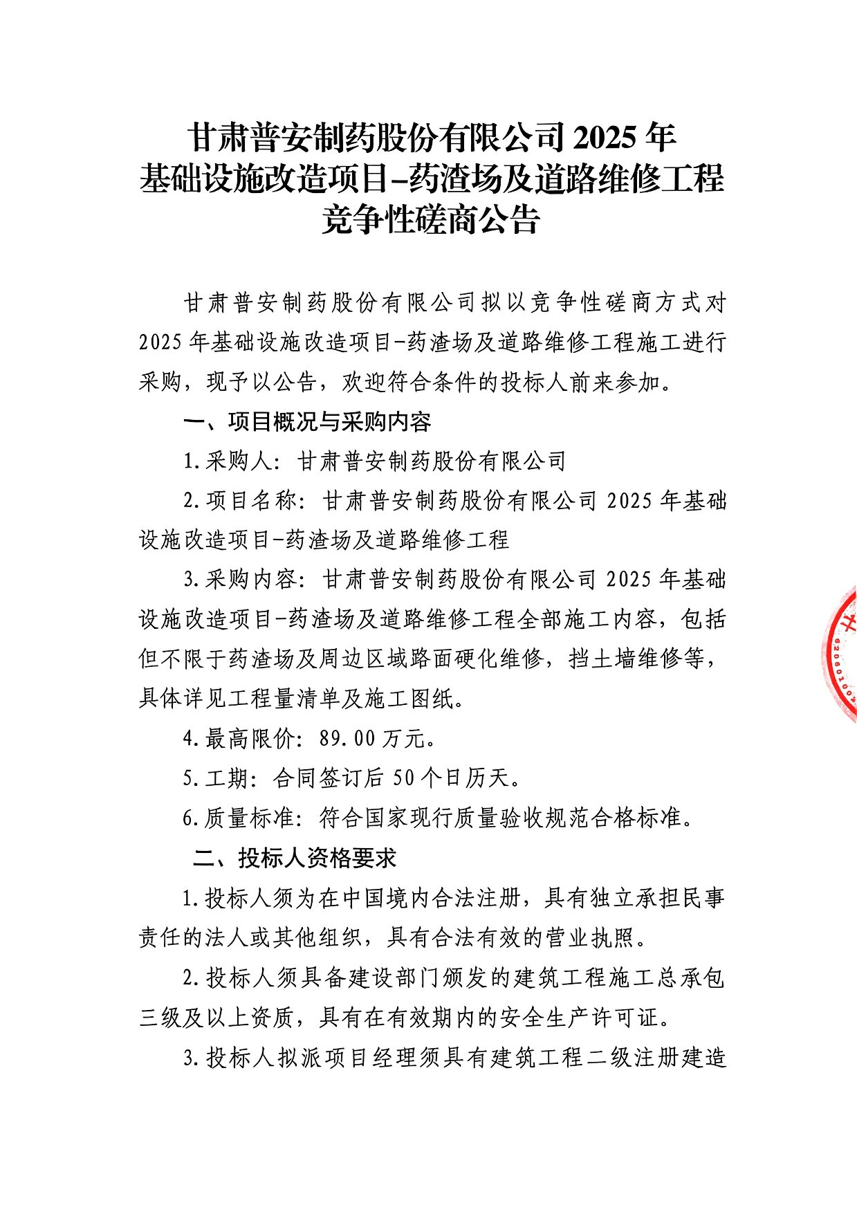甘肅普安制藥股份有限公司2025年基礎(chǔ)設(shè)施改造項目-藥渣場及道路維修工程競爭性磋商公告