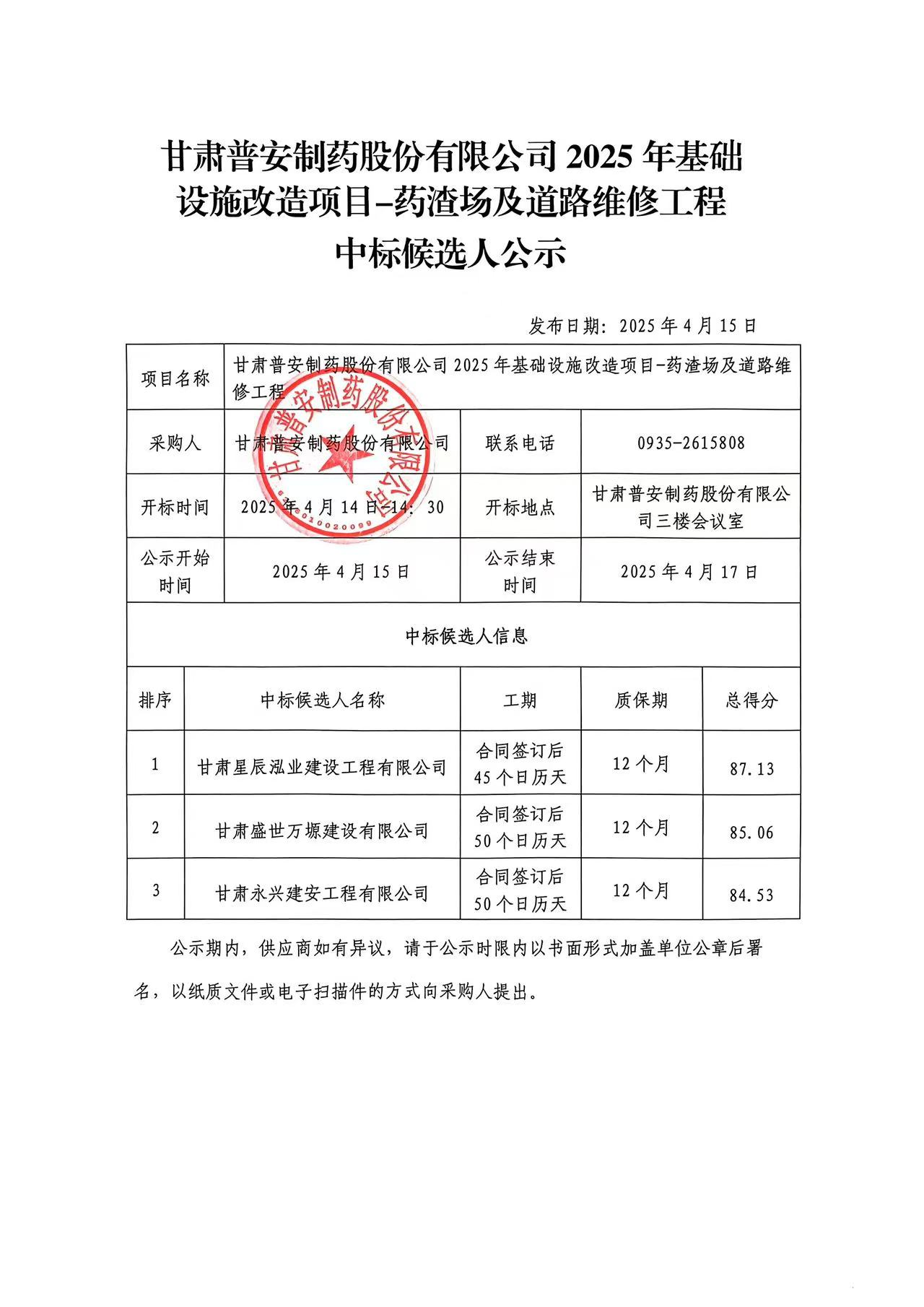 甘肅普安制藥股份有限公司2025年基礎(chǔ)設(shè)施改造項(xiàng)目-藥渣場(chǎng)及道路維修工程中標(biāo)候選人公示