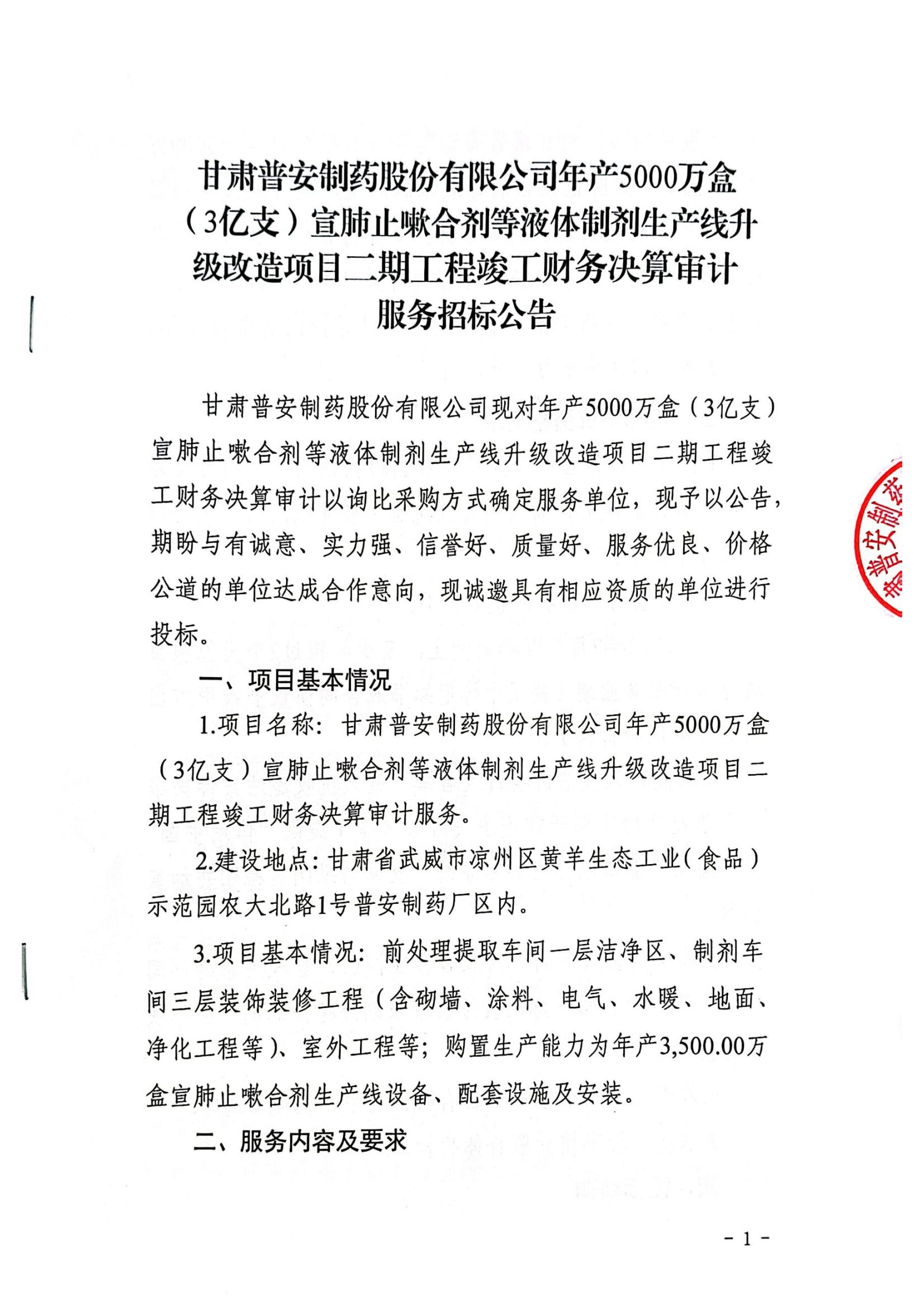 甘肅普安制藥股份有限公司年產(chǎn)5000萬盒宣肺止嗽合劑等液體制劑生產(chǎn)線升級改造項目二期竣工決算審計服務(wù)招標(biāo)公告