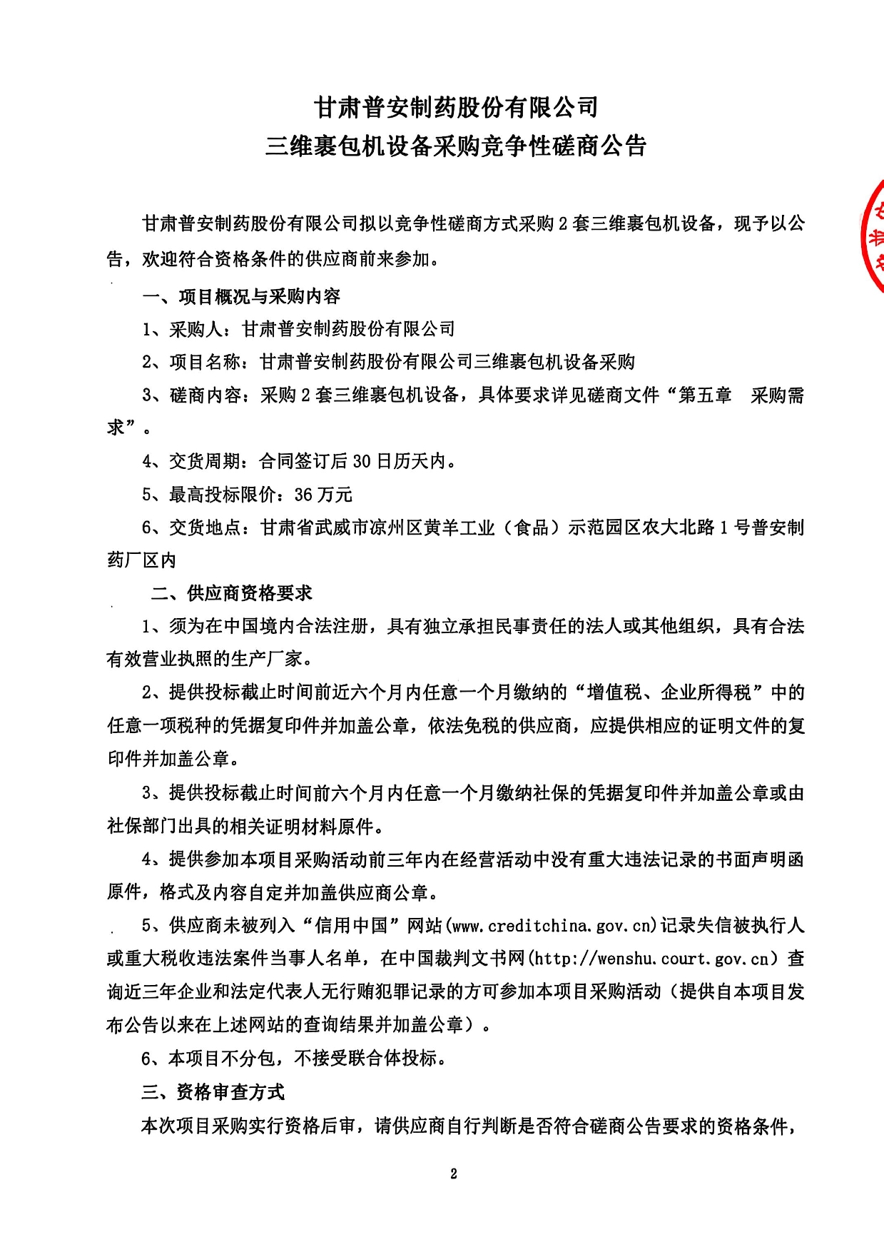 甘肅普安制藥股份有限公司三維裹包機(jī)設(shè)備采購(gòu)競(jìng)爭(zhēng)性磋商公告